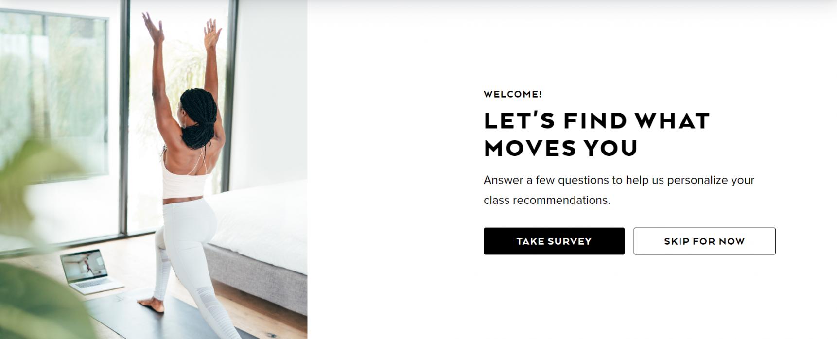 Some sites ask new visitors to answer key questions and provide their preferences to make custom recommendations. Here’s an example from Alo Moves site to inspire your content and product recommendation strategies: