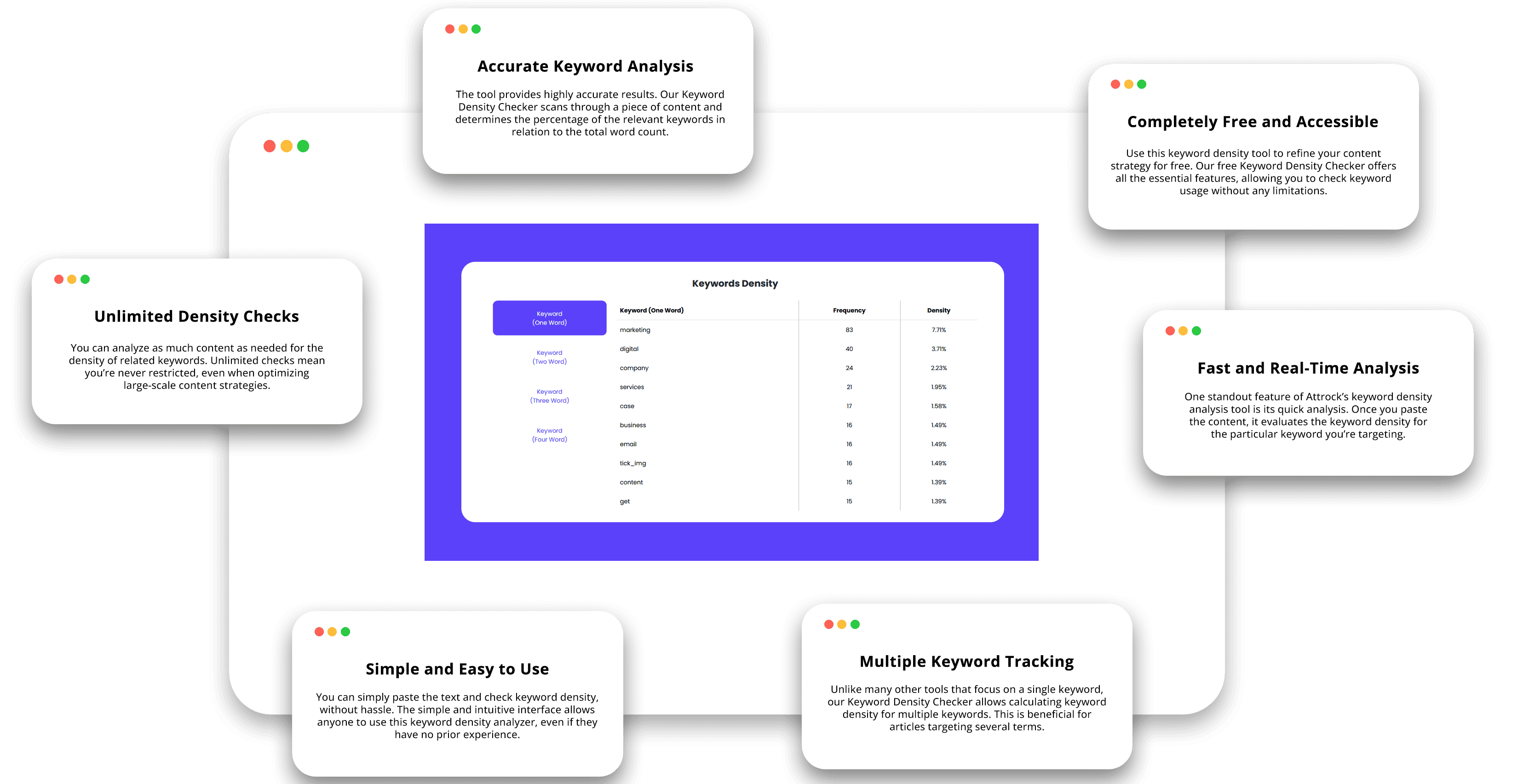 Attrock’s Keyword Density Checker can help you optimize content without overstuffing keywords so it can rank well on search engines. Here's what sets it apart from any other keyword density checker.
