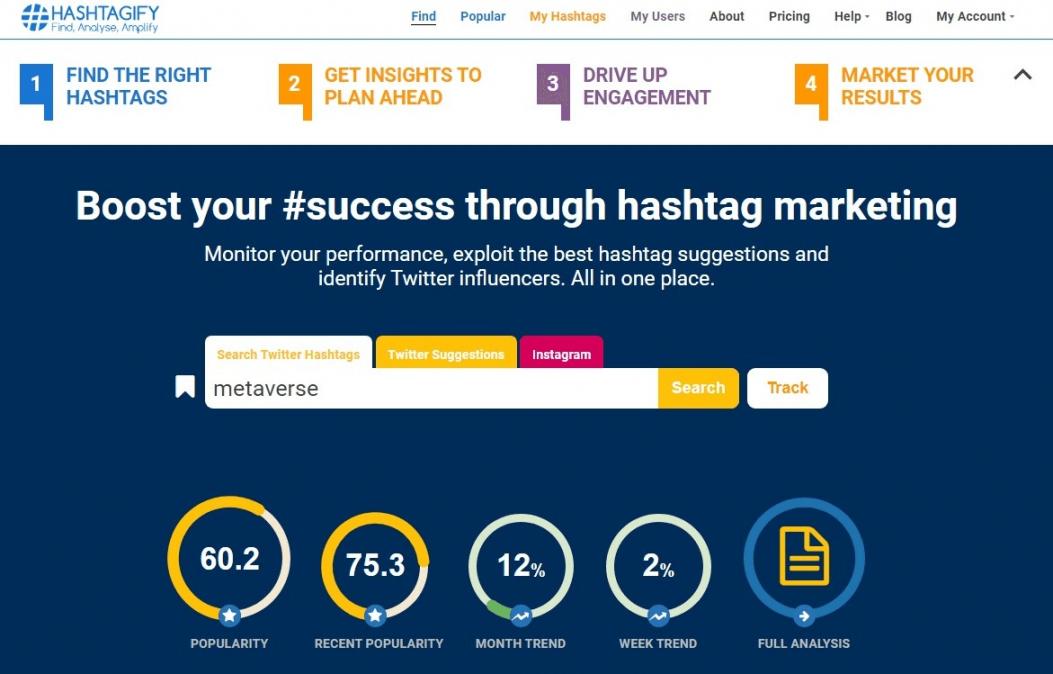 It's one of the Hashtagify alternatives that offers functionalities to create, analyze, generate, and search for top hashtags in one centralized location.